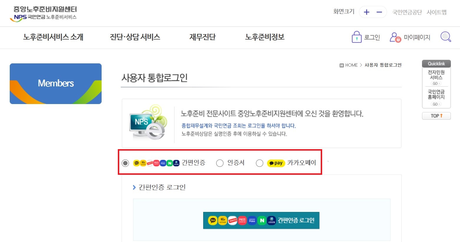4. 간편인증을 통해 로그인합니다. (간편인증 로그인 외에 인증서, 카카오페이로도 인증이 가능합니다.)