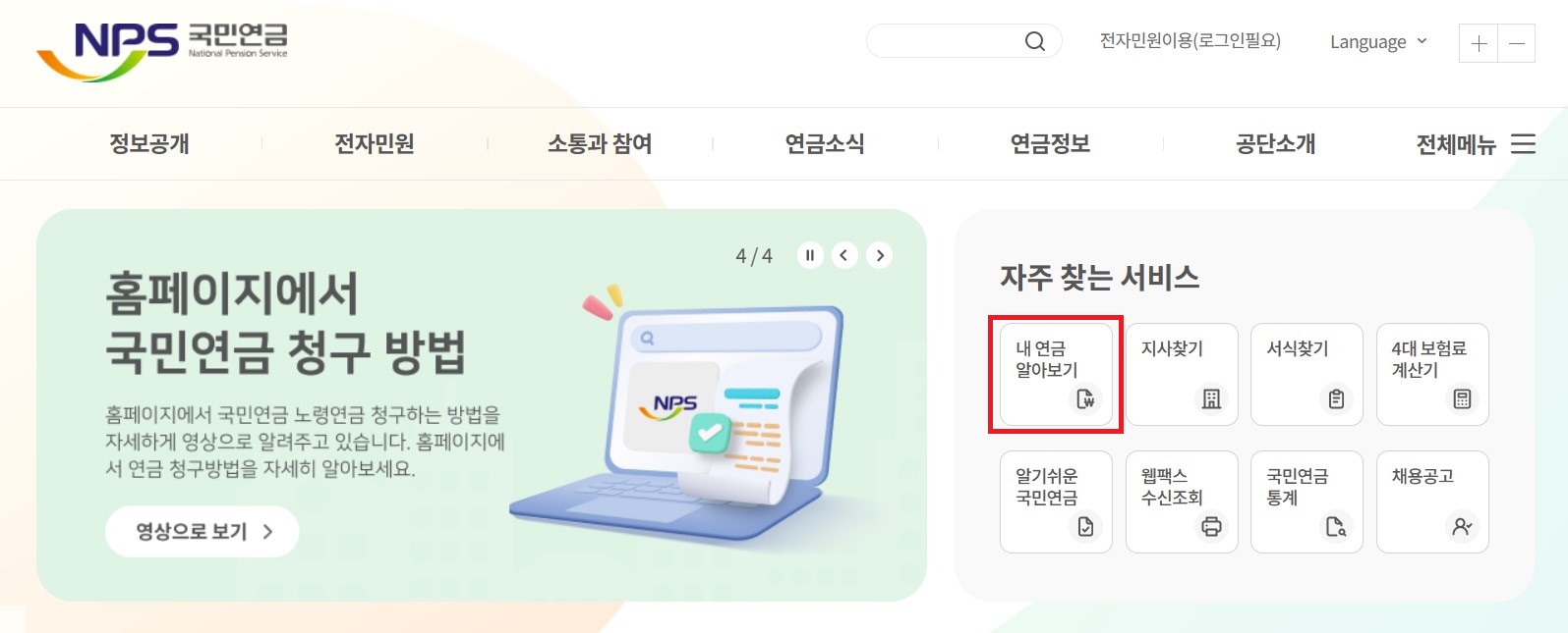 1. 국민연금 링크를 통해 홈페이지로 이동합니다.