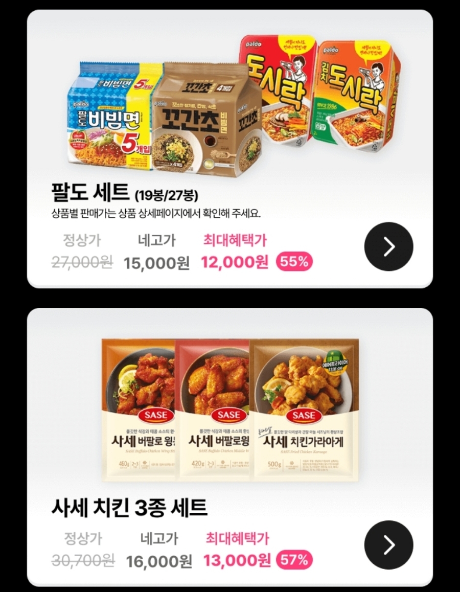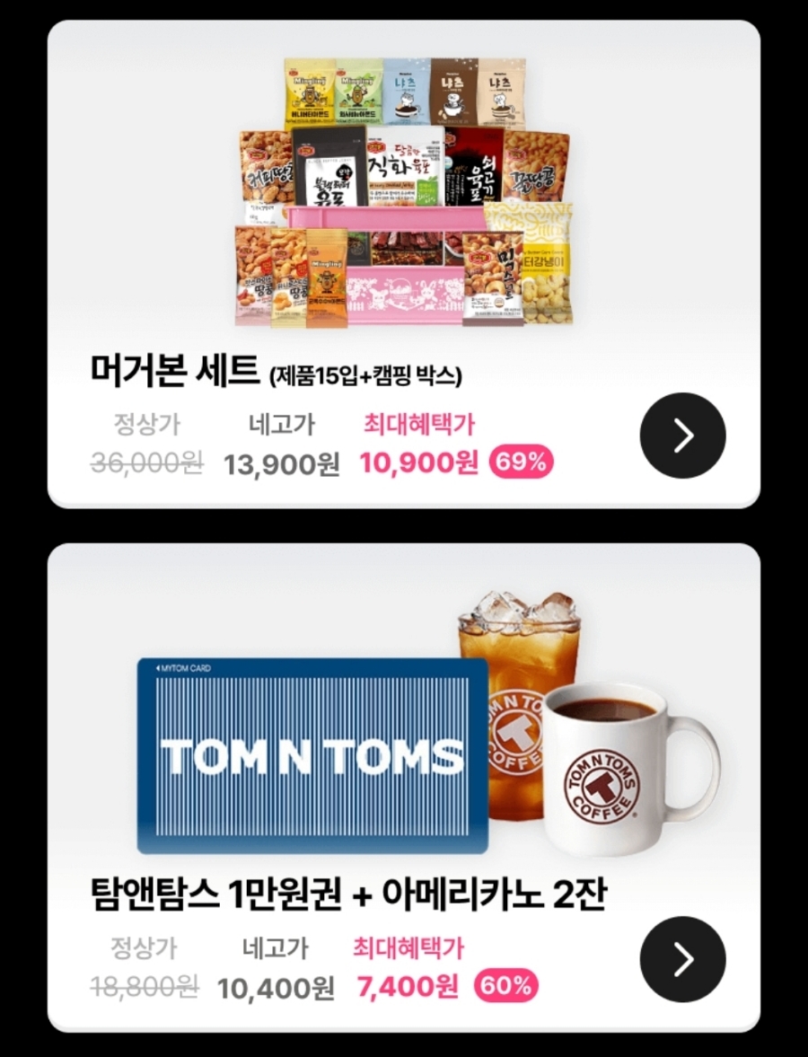 고물가 시대에 저렴하게 살 수 있는 식품이 있다면 언제든지 환영인데, 팔도 라면 세트와 사세치킨입니다. 호불호없이 누구나 즐겨서 먹는 식품이기 때문에 저렴하게 구매하시면 좋을 것 같습니다. 그리고 머거본 세트와 탐앤탐스 커피 쿠폰 역시 저렴하게 구매할 수 있으니 필요하신 분들은 구매하시면 좋을 것 같습니다.