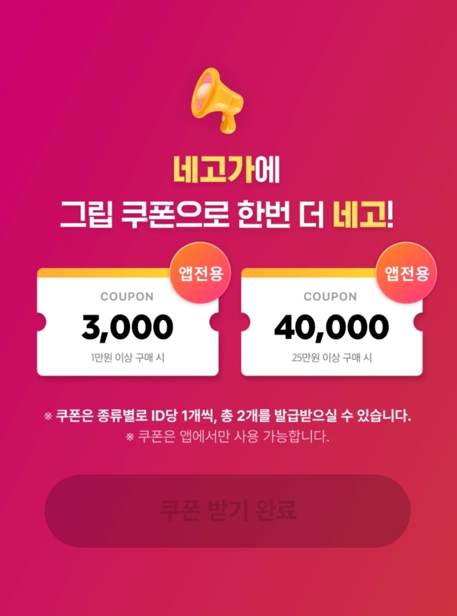 네고가에서 그립 쿠폰을 사용하면 한번 더 금액별로 할인이 된다고 하니, 구매하실 분들을 잊지 마시고 쿠폰 다운 받아서 사용하시면 좋을 것 같습니다.