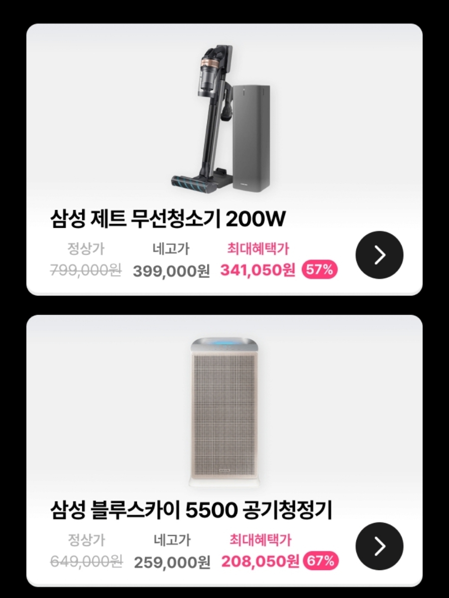 삼성 제트 무선청소기 200W가 무려 399,000원에, 삼성 블루스카이 5500 공기청정기는 259,000원에 네고 성공을 했습니다. 봄날씨만 되면 오는 불청객 미세먼지때문에 호흡기가 많이 힘드실텐데 이번 기회에 청소기와 공기청정기 저렴하게 구매해서 우리의 건강을 지키면 좋을 것 같습니다. 그리고 최대혜택가는 추가 할인 혜택 쿠폰이 있으면 더 저렴하게 구매하실 수 있습니다.