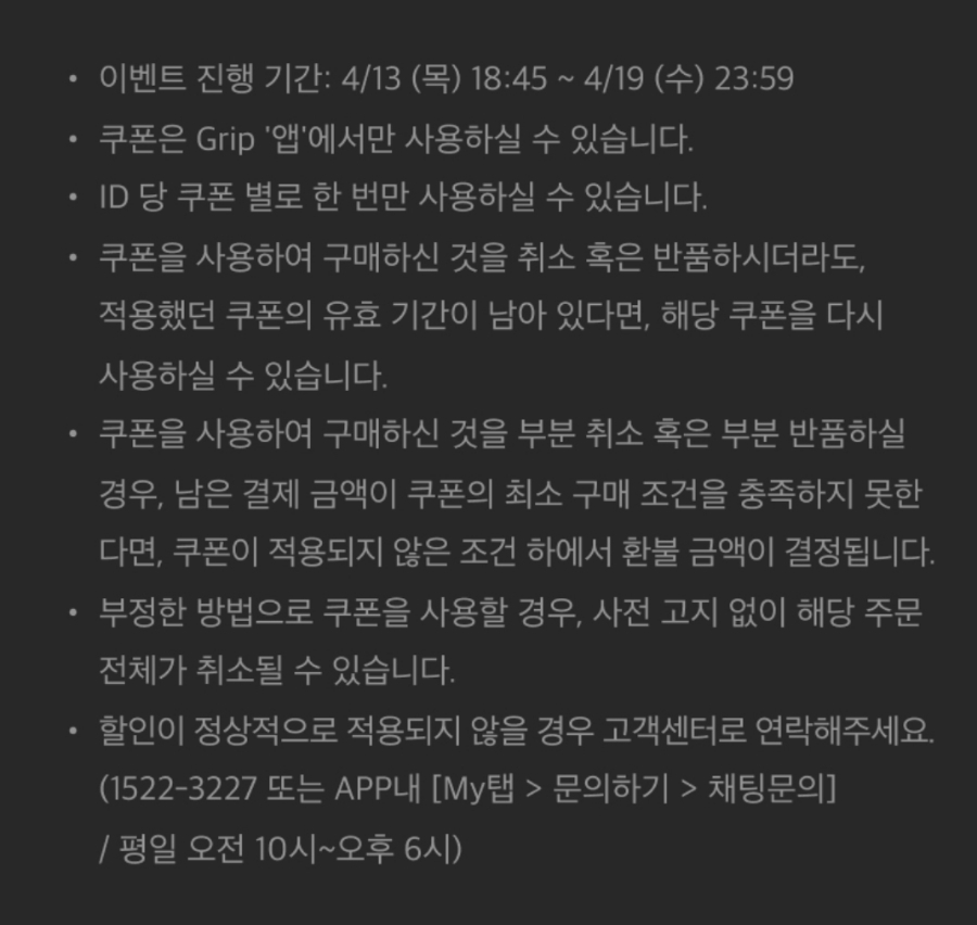 이벤트 기간은 4월 13일(목) ~ 1월 19(수)까지 진행된다고 하니 구매하실 분들은 휴대폰에서 '그립' 앱을 꼭 설치하셔서 구매하시면 되겠습니다. 'Grip' 글자 누르시면 'Grip'앱으로 바로 이동하실 수 있습니다.