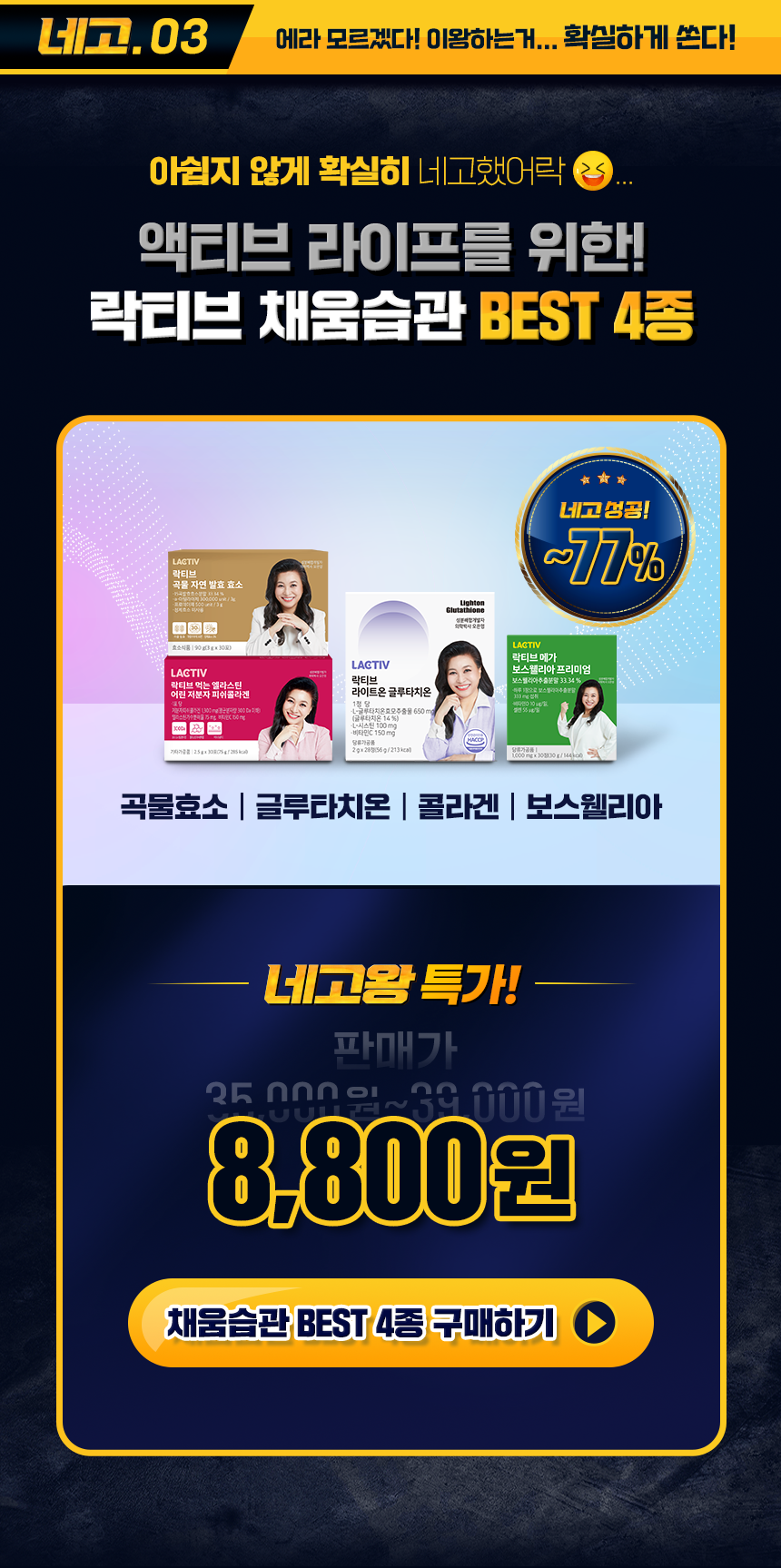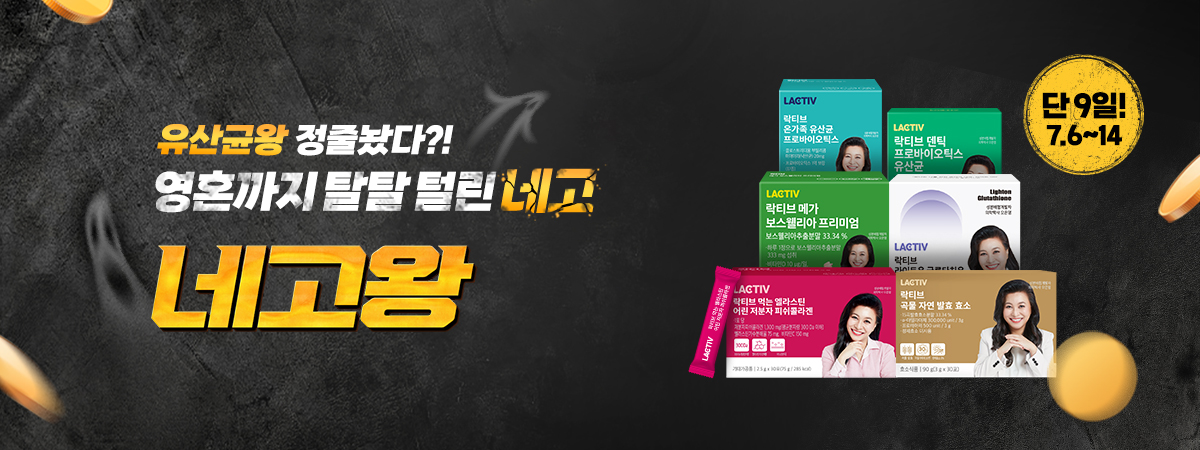 네고왕에서 이번에는 건강보조식품을 털어 왔습니다. 바로 '락티브'라는 브랜드인데 이번 네고왕에서 최대 77% 할인가로 상품을 내놓았습니다. 그럼 어떤 상품들이 있는지 알려드리도록 하겠습니다.
