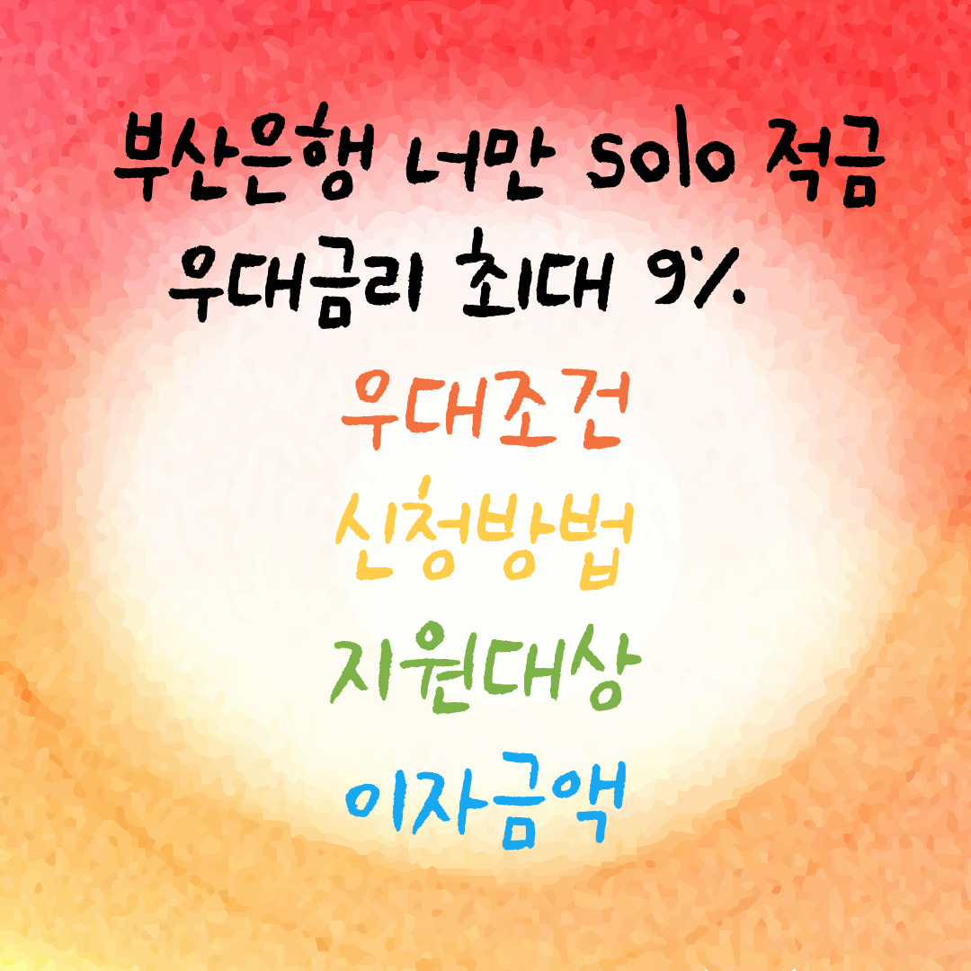 부산은행에서 9%의 고금리 적금이 출시되었습니다. 부산은행 너만 solo 적금인데, 예비 신혼부부, 청년들이 가입하면 좋은 상품이라 관심 있으신 분들은 사전 알림 신청하시고, 이벤트도 참여해 보시면 좋을 것 같습니다.
