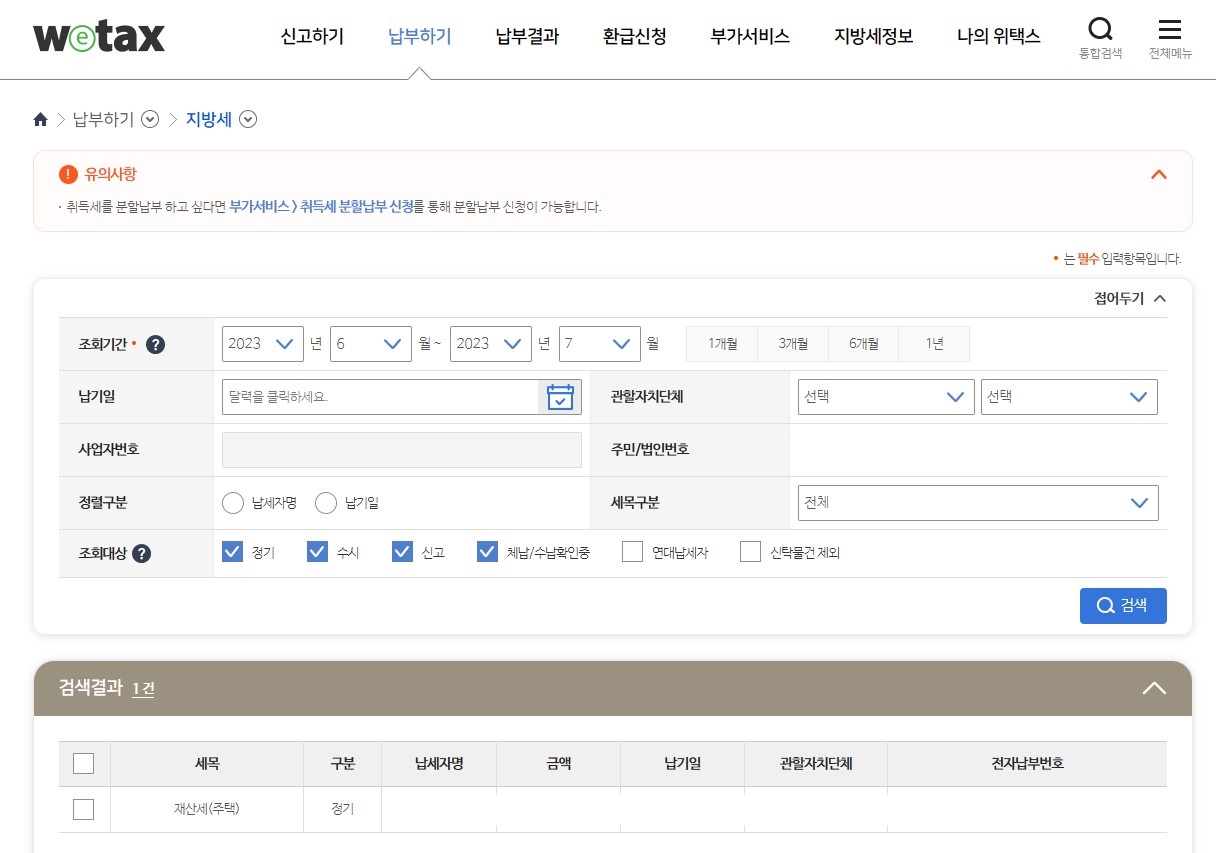 지금 일자 기준으로는 이미 고지서 발송 및 재산세 계산이 완료된 상태이므로 조회만 해보면 됩니다.