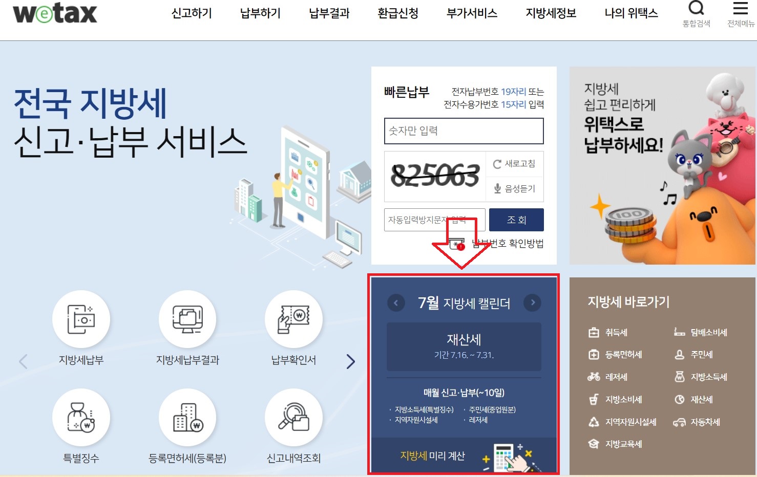 1. Wetax 위택스 홈페이지에 로그인을 한 후 메인의 지방세 캘린더, 재산세를 클릭합니다.